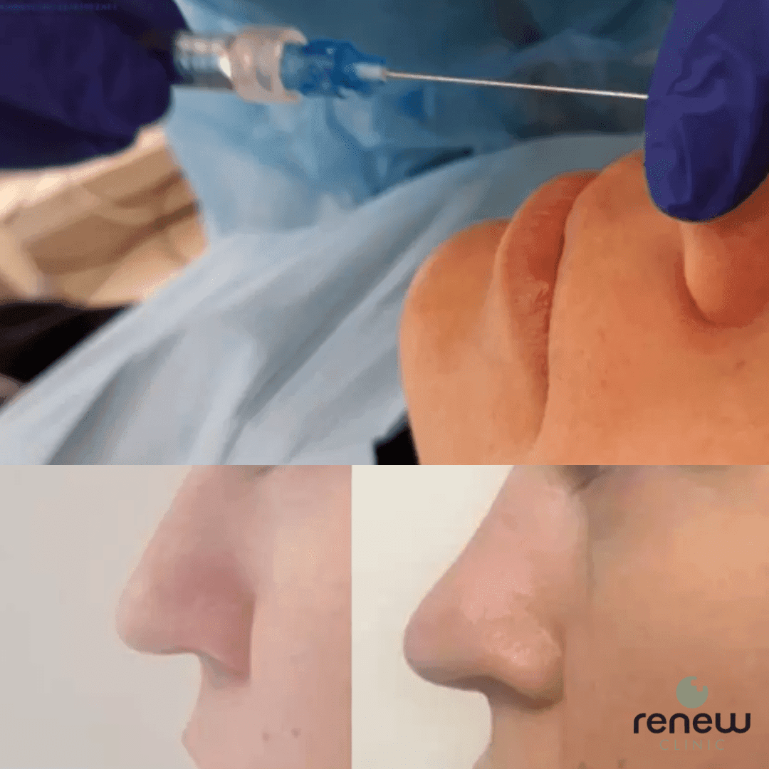 Zabieg bezoperacyjnej korekty nosa zaczynamy od demakijażu oraz dezynfekcji okolicy poddawanej zabiegowi. Stosowane do wykonania zabiegu preparaty zawierają w sobie lidokainę, dzięki czemu wkłucia są mniej bolesne. Po podaniu preparatu lekarz wykonuje delikatny masaż który pomaga w równomiernym rozmieszczeniu kwasu.